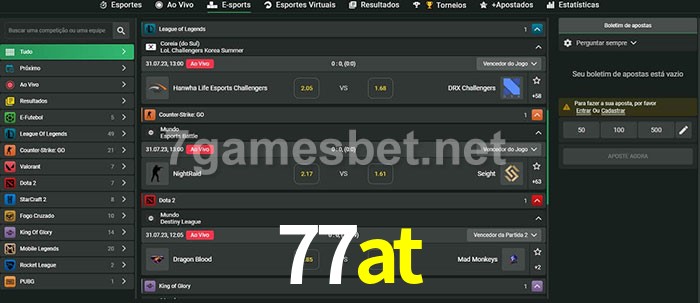 O 77at oferece uma grande seleção de opções de apostas em e-sports com probabilidades competitivas